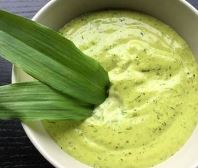 Hæld mayoen over i en skål og pynt evt. med et ramsløgblad. Server. |